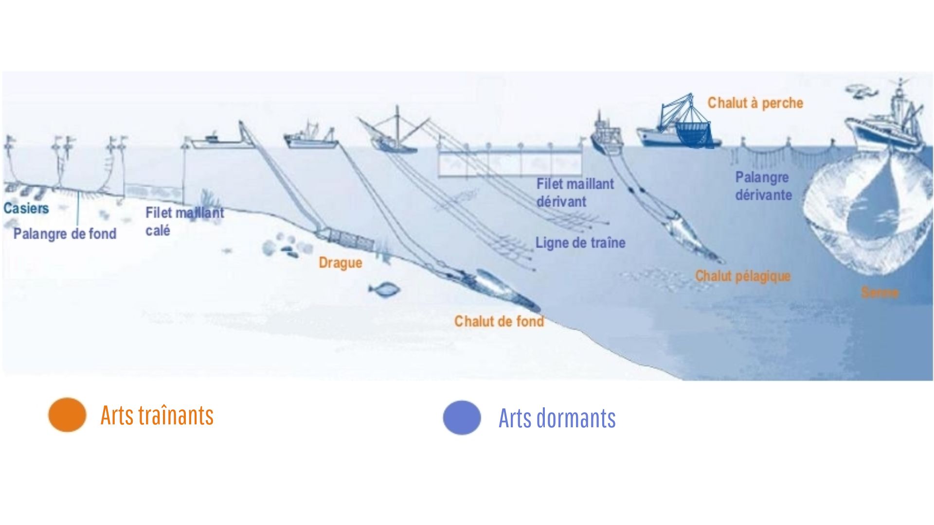 50% des produits de la mer présents sur les étals sont capturés au fond des océans selon l’Ifremer. Les techniques traînantes, et particulièrement les chaluts de fond, sont les plus destructrices pour les écosystèmes marins. Au printemps 2025, un extrait du documentaire l’Appel de l’océan du célèbre réalisateur David Attenborough a particulièrement choqué. On y voit pour la première fois un chalut de fond qui racle et détruit tout sur son passage, ne laissant aucune chance aux poissons juvéniles.